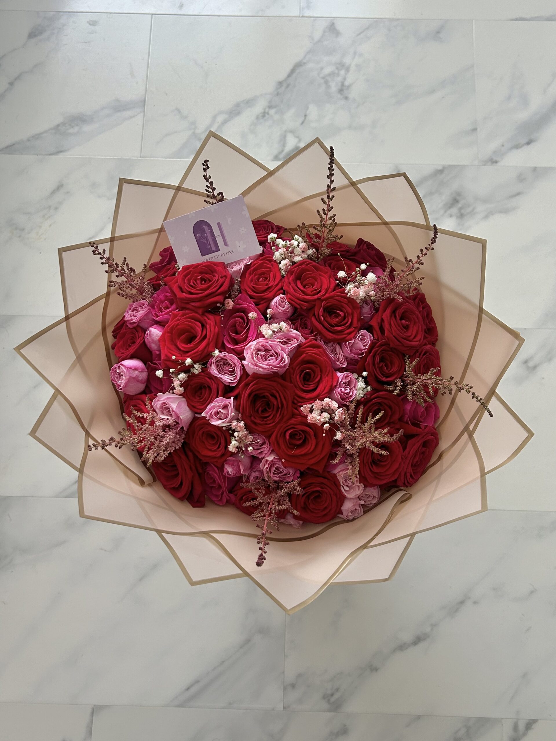 A dark elegance that captivates the eyes. Made with roses, spray roses and astilbe. Wrapped with beige waterproof paper.