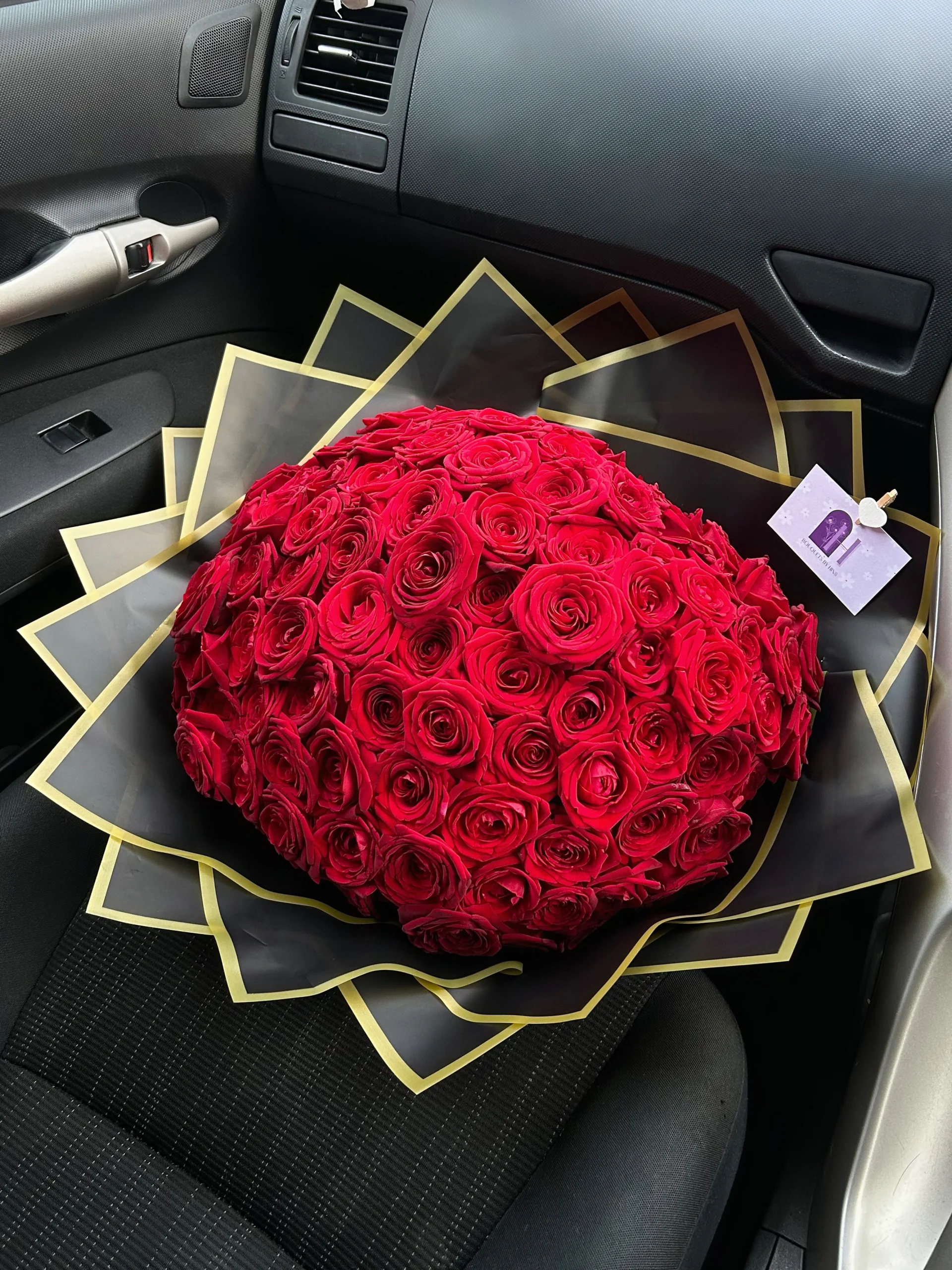 One hundred luxury premium red roses. Wrapped in black waterproof paper.