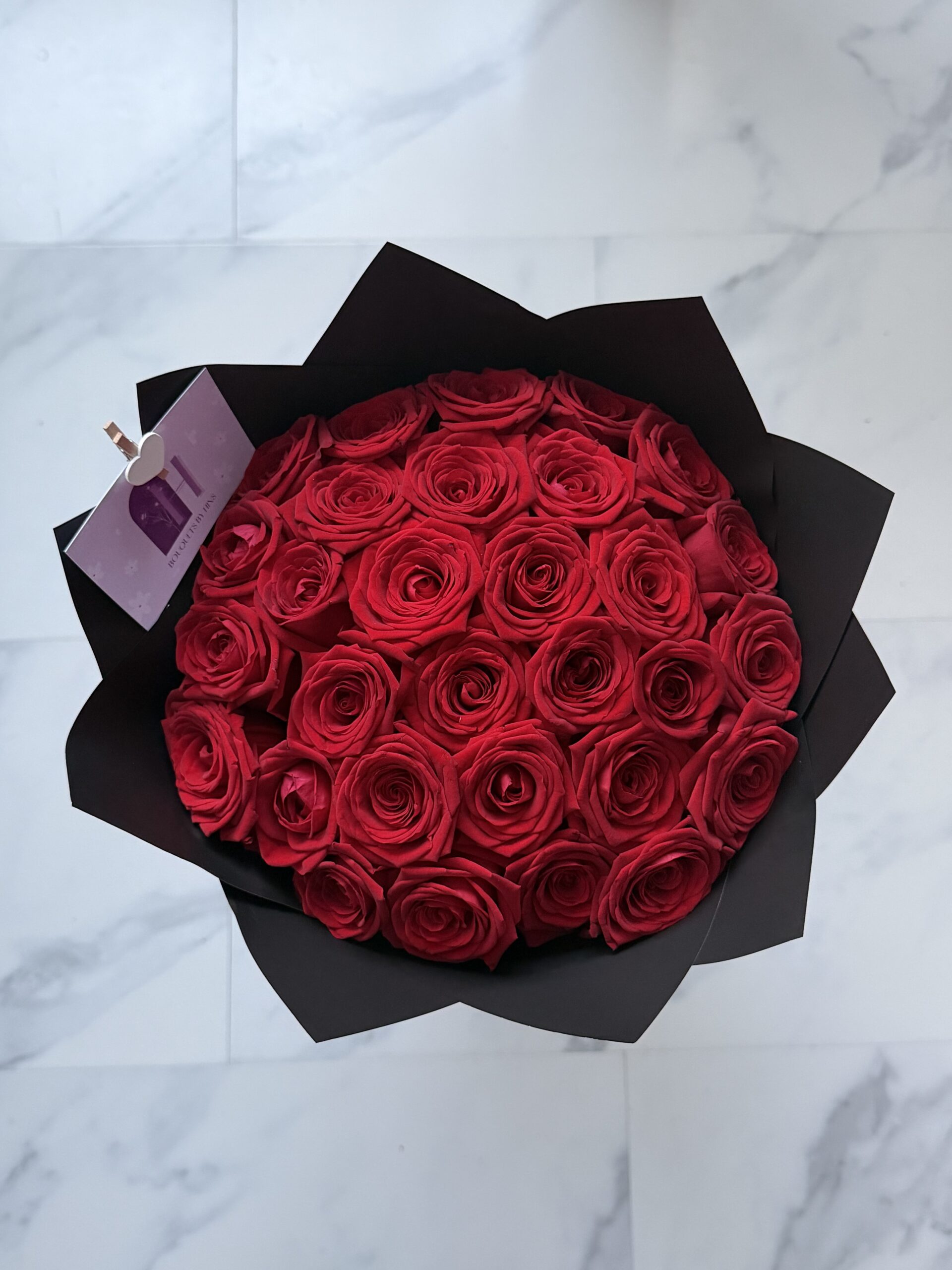 Thirty ways to say I love you. Made with luxury premium red roses. Wrapped in black waterproof paper.