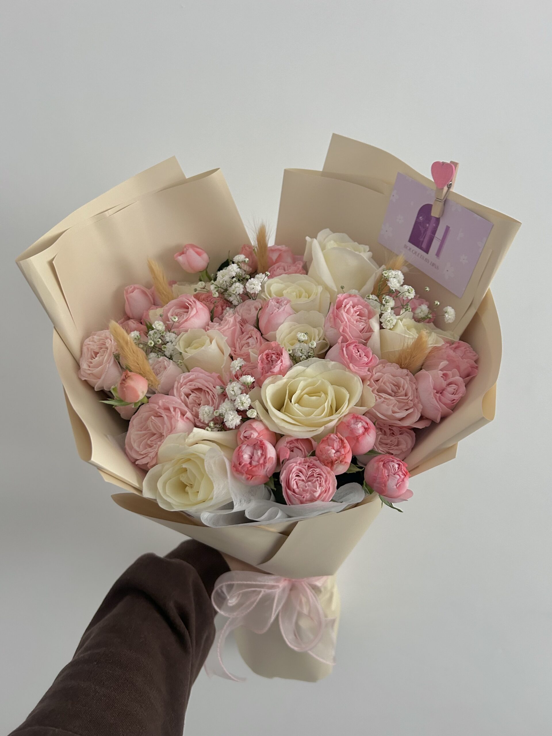Soft marshmallow blooms. Made with roses and spray roses. Wrapped in cream waterproof paper.