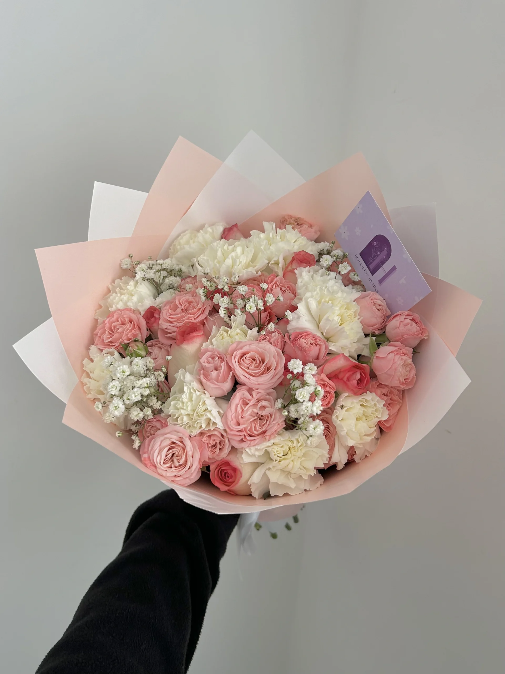 A sweet and sour candy-like bouquet. Made with carnations, roses and spray roses. Wrapped in two toned waterproof paper.